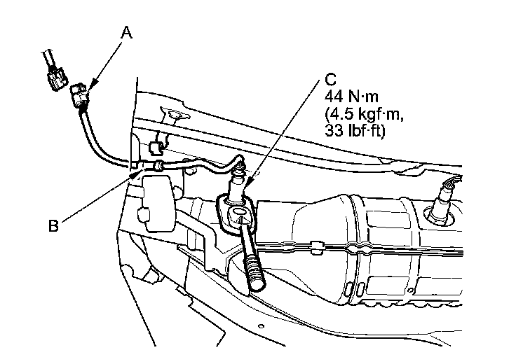 1. Disconnect the A/F sensor 4P connector (A) and the clip (B), then remove the A/F sensor (C).