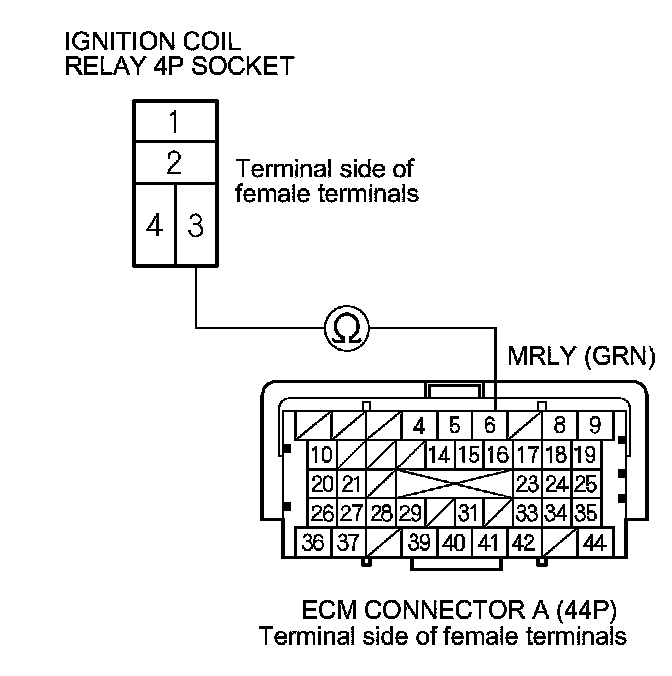 12. Check for continuity between ignition coil relay 4P socket terminal No. 3 and ECM connector terminal A6.