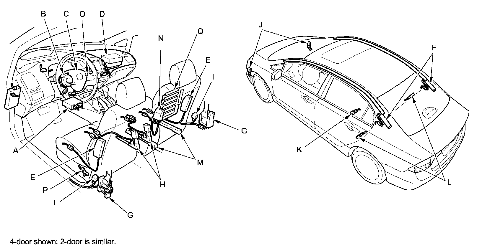 The SRS is a safety device which, when used with the front seat belts, is designed to help protect the driver and front passenger in a frontal impact exceeding a certain set limit. The system consists of the SRS unit (A), including safing sensor and impact sensor, the cable reel (B), the driver's airbag (C), the front passenger's airbag (D), the side airbags (E), the side curtain airbags (F), the front seat belt tensioners (G), the front seat belt buckle tensioners (H), the side impact sensors (first) (I), the front impact sensors (J), the rear safing sensor (K), and the side impact sensors (second) (L).