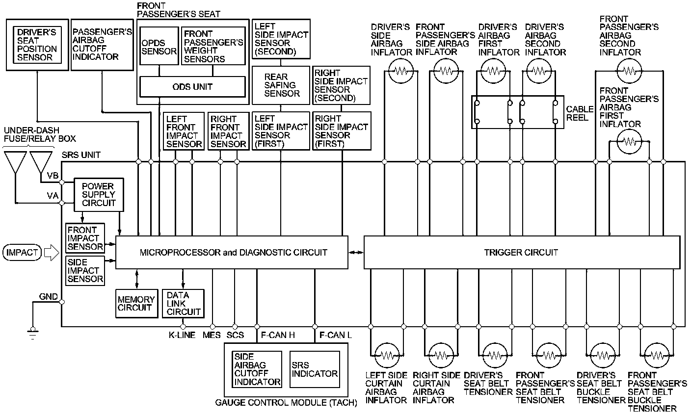 The main circuit in the SRS unit senses and analyzes the force of impact and, if necessary, ignites the inflator charges. If battery voltage is too low or power is disconnected due to the impact, the voltage regulator and the back-up power circuit will keep voltage at a constant level.