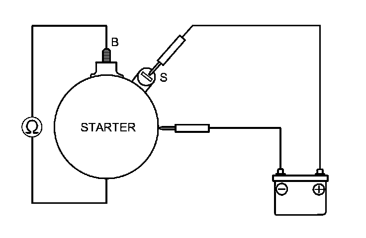 4. Connect the battery as shown, and check for continuity between the B terminal and the starter body. If there is continuity, it is working properly.