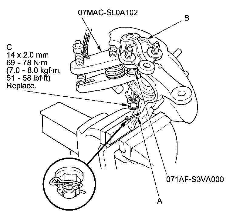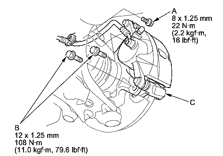 4. Remove the brake caliper bracket mounting bolts (B), then remove the caliper assembly (C) from the knuckle. To prevent damage to the caliper assembly or the brake hose, use a short piece of wire to hang the caliper assembly from the undercarriage. Do not twist the brake hose excessively.