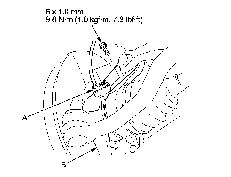 5. Remove the wheel speed sensor (A) from the knuckle (B). Do not disconnect the wheel speed sensor connector.