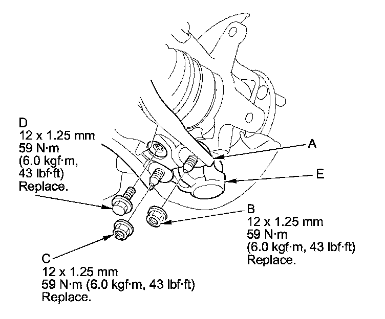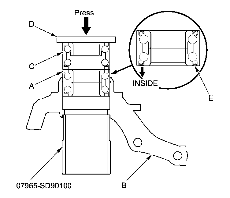 - Install the wheel bearing with the wheel speed sensor magnetic encoder (E) (brown color), toward the inside of the knuckle.
