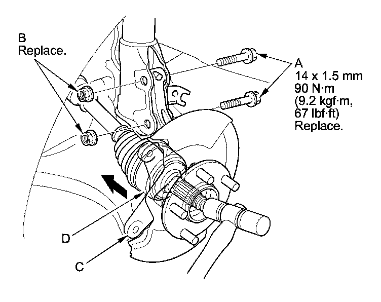 NOTE: During installation, install the new flange bolt and the new self-locking nuts. After lightly tightening all three fasteners, tighten them to the specified torque in the following order; the nut on the front (B), the nut on the rear (C), then the bolt (D).