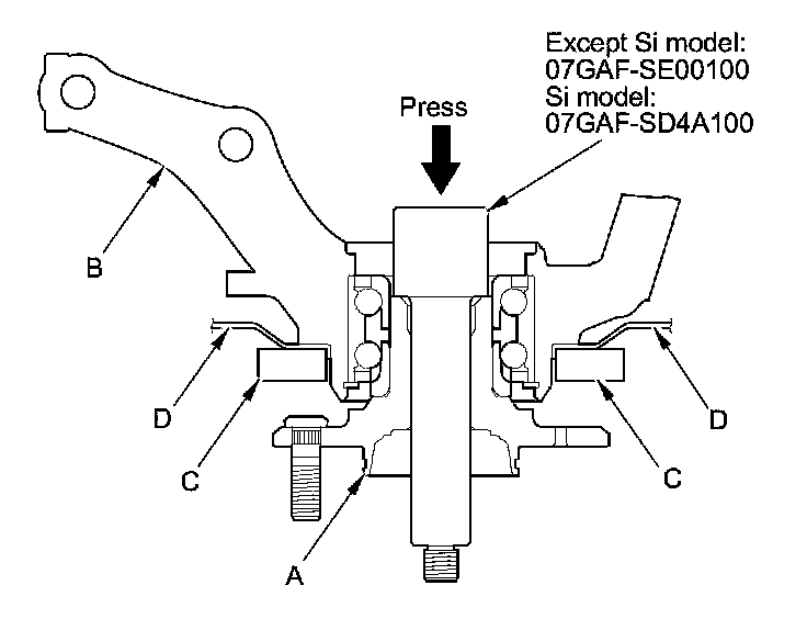 2. Separate the hub (A) from the knuckle (B) using the hub dis/assembly pin and a hydraulic press. Hold the knuckle with the attachment (C) of the hydraulic press or equivalent tool. Be careful not to damage or deform the splash guard (D). Hold onto the hub to keep it from falling when pressed clear.