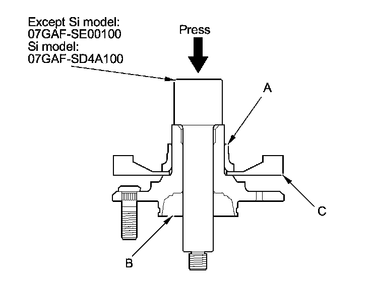 3. Press out the wheel bearing inner race (A) of the hub (B) using the hub dis/assembly pin, a commercially available bearing separator (C), and a press.