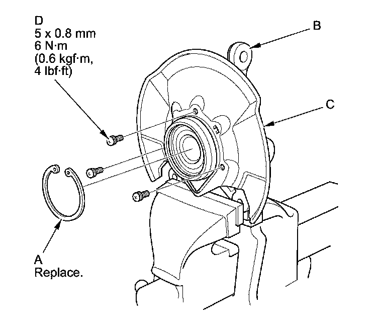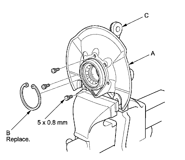 4. Remove the splash guard (A) and the snap ring (B) from the knuckle (C).