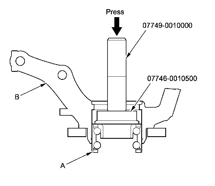 5. Press the wheel bearing (A) out of the knuckle (B) using the attachment, the driver handle, and a press.