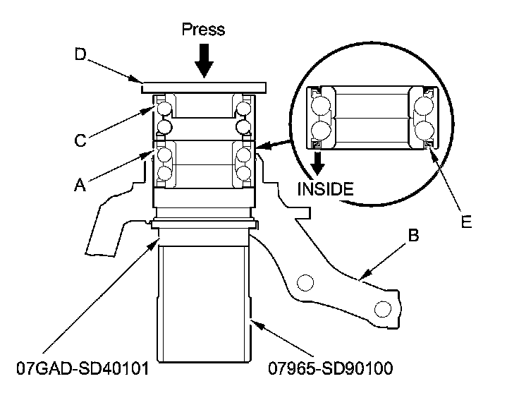 7. Press a new wheel bearing (A) into the knuckle (B) using the old bearing (C), a steel plate (D), the attachment, the support base, and a press.
