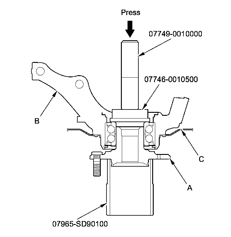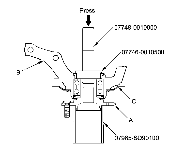 10. Install the hub (A) onto the knuckle (B) using the attachment, the driver handle, the support base, and a hydraulic press. Be careful not to damage the splash guard (C).