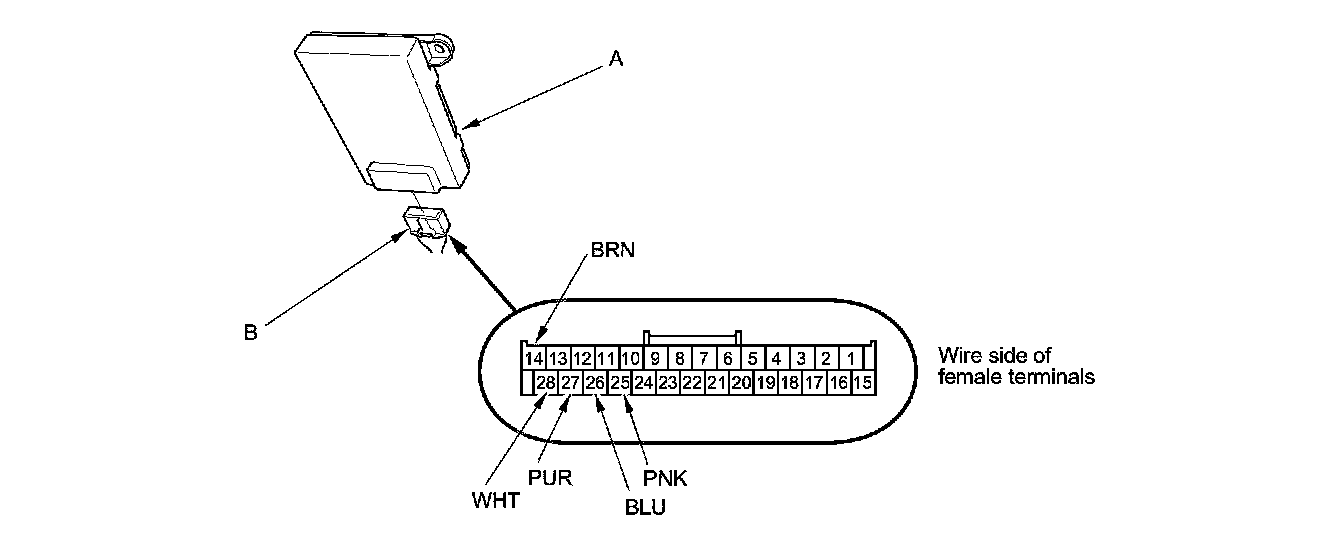 3. Inspect the connector (B) and socket terminals for a good pinfit to be sure they are all making good contact.
