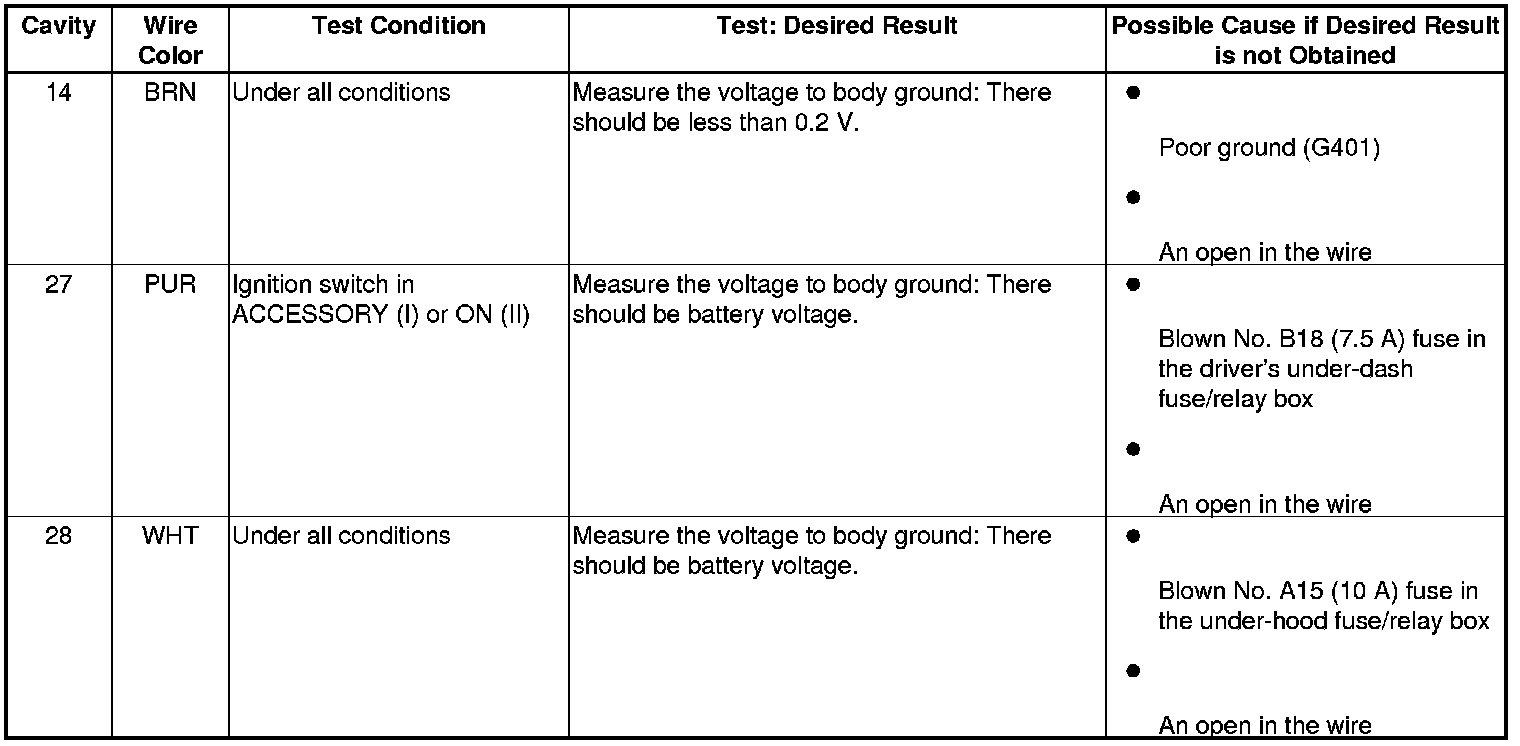 4. Reconnect the connector, and make these input tests at the connector.