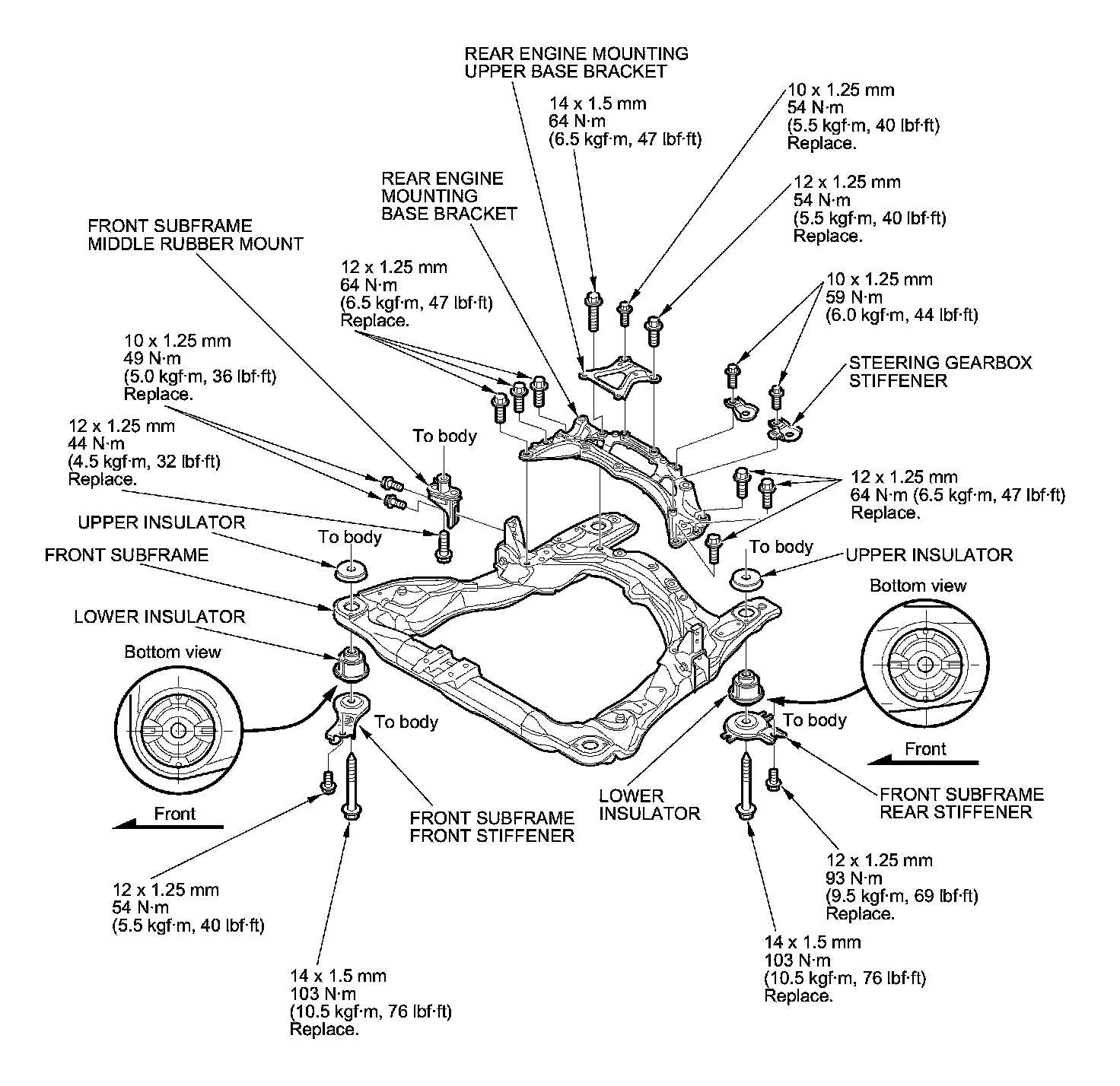 After removing the subframe mounting bolts, the front subframe middle rubber mount mounting bolts, the front subframe front stiffener mounting bolts, the front subframe rear stiffener mounting bolts, the rear engine mounting base bracket mounting bolts, and the rear engine mounting upper base bracket mounting bolts, be sure to replace them with new ones.