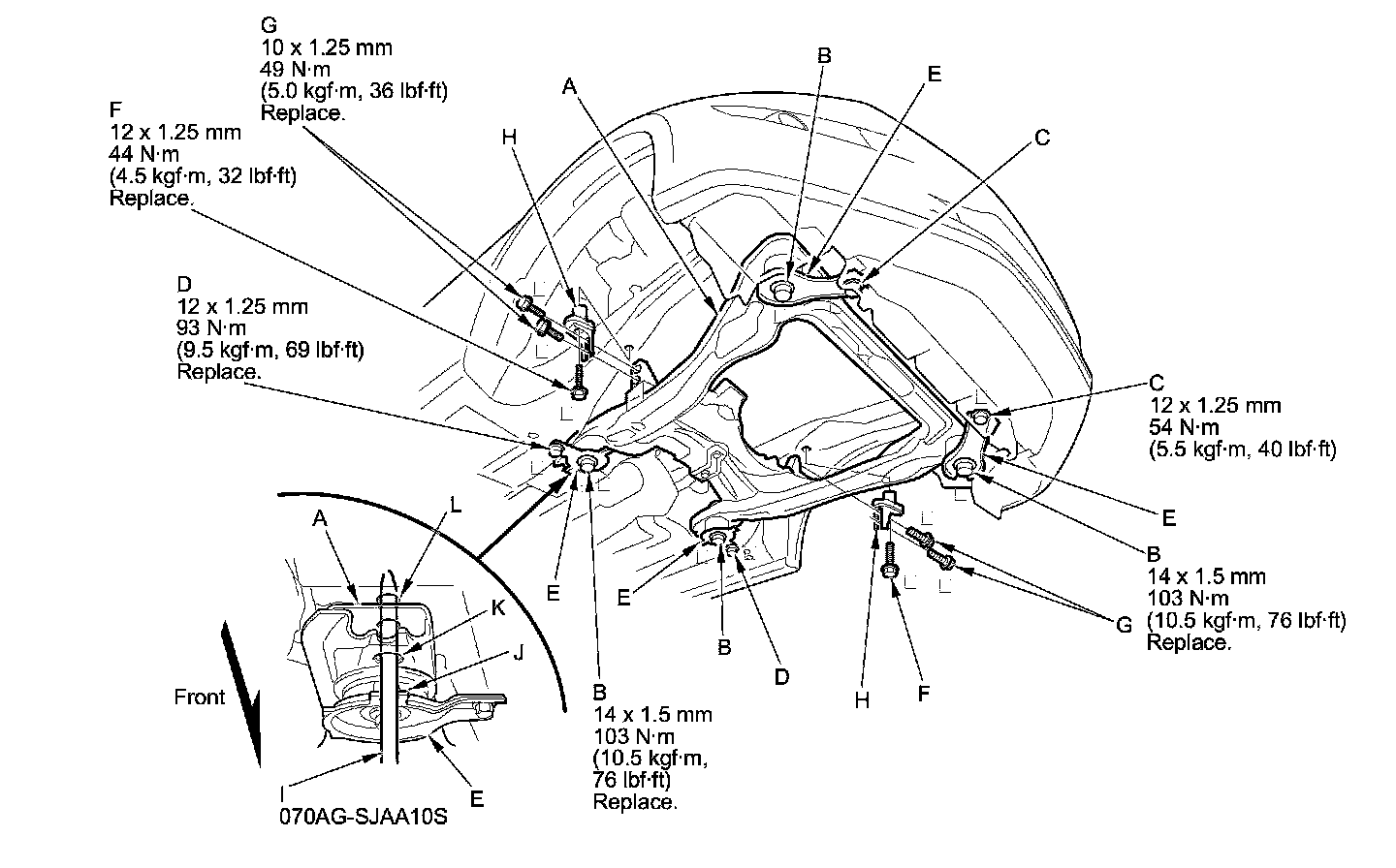 2. Loosely install the new subframe middle mounting bolts (F, G) securing the subframe middle mounts (H).