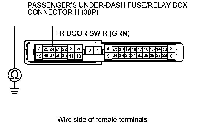 8. Check for continuity between passenger's under-dash fuse/relay box connector H (38P) terminal No. 24 and body ground.
