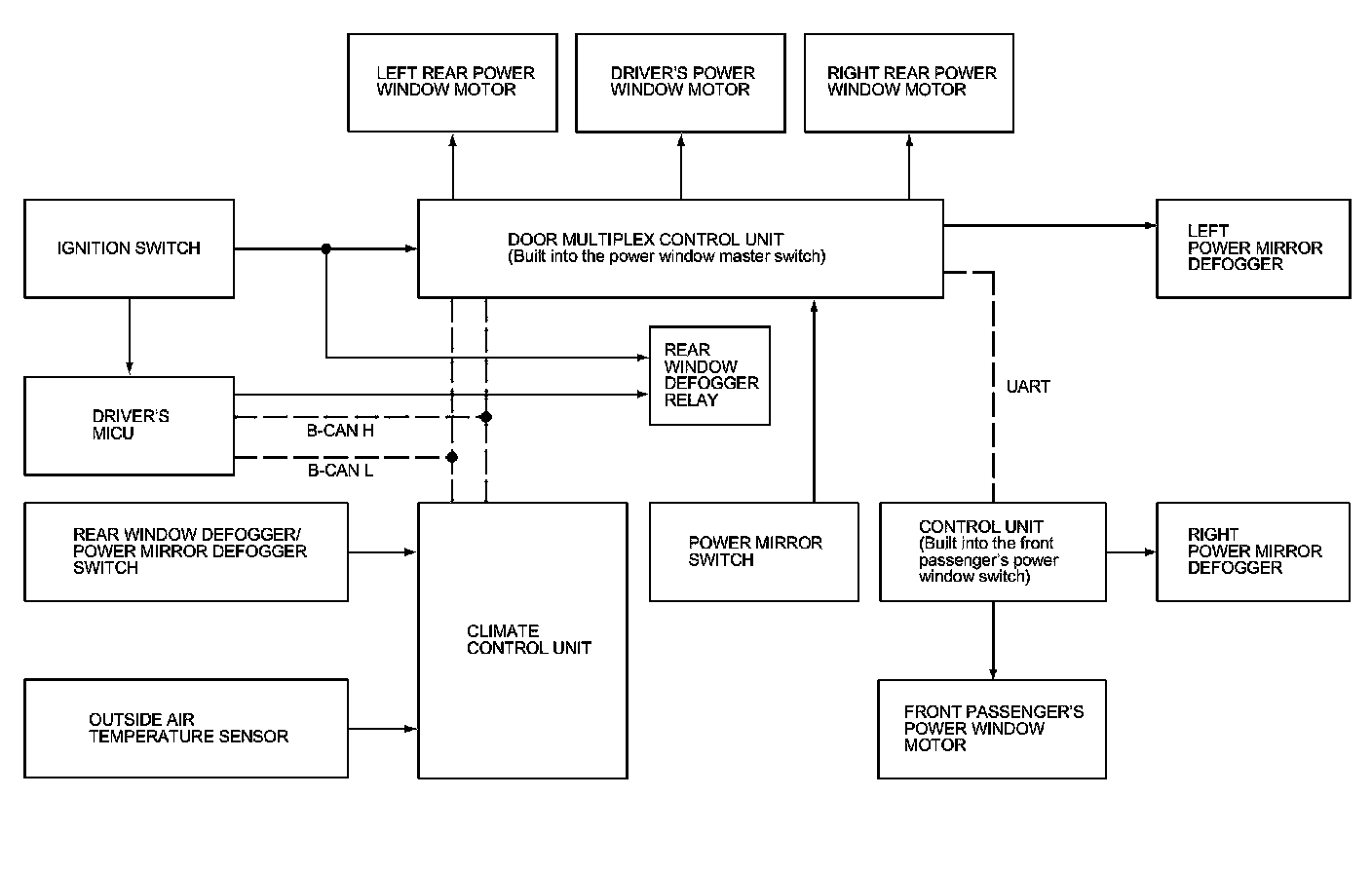 - If the door multiplex control unit receives a rear window defogger/power mirror defogger switch input signal from the climate control unit during power mirror defogger output, the door multiplex control unit shuts off the auto operation function immediately.