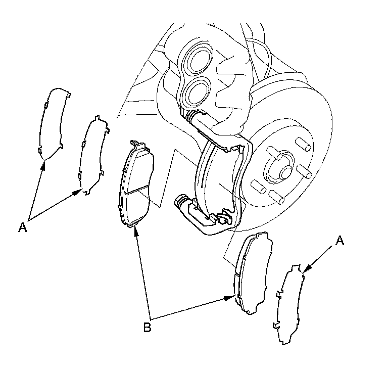 7. Remove the pad shims (A) and the brake pads (B).