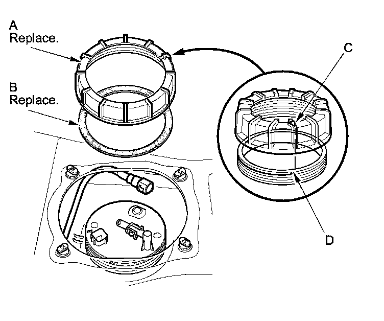 1. Temporarily attach a new base gasket (A) to the fuel tank unit (B), then insert the fuel tank unit partially into the fuel tank.