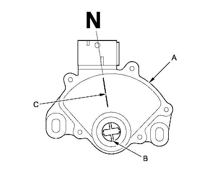 12. Set the transmission range switch (A) to the N position. The transmission range switch clicks in the N position, by turning the selector control shaft hub (B) of the switch until it aligns with the N position line (C).