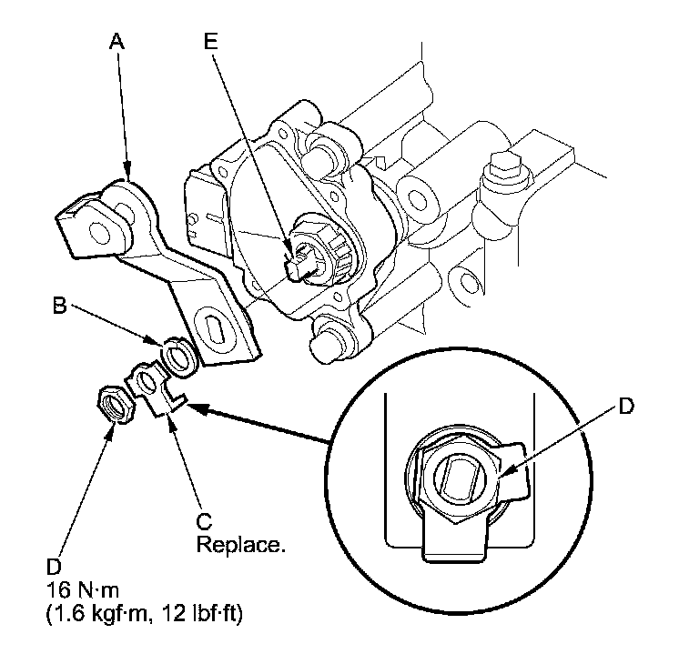 17. Install the control lever (A), the spring washer (B), a new lock washer (C), and the locknut (D) on the selector control shaft (E). Bend the lock tab of the lock washer against the locknut.