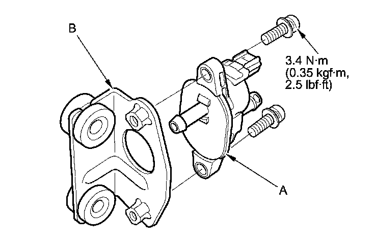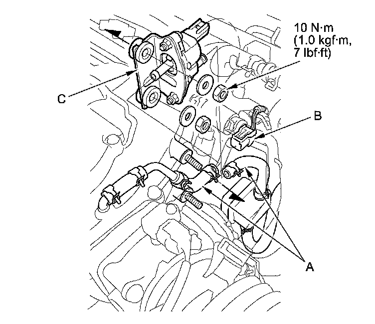 1. Disconnect the hoses (A) and the EVAP canister purge valve 2P connector (B).