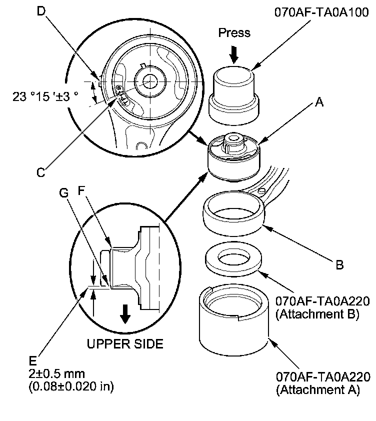 - After installation, check the protrusion (E) of the bushing outer sleeve (F) through the lower arm bushing hole (G).