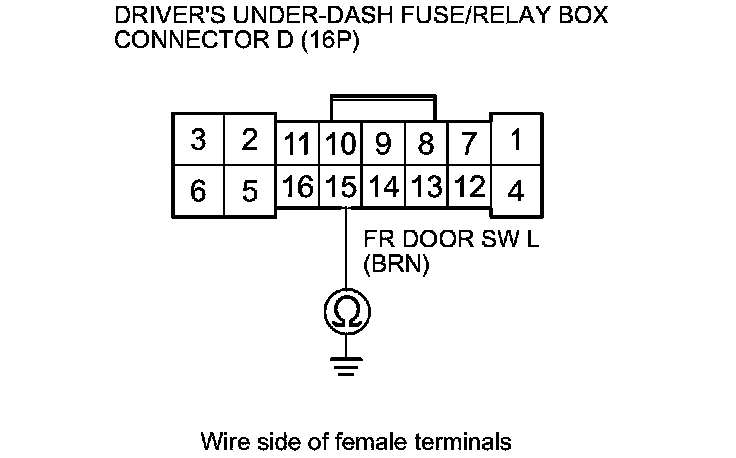 8. Check for continuity between driver's under-dash fuse/relay box connector D (16P) terminal No. 15 and body ground.