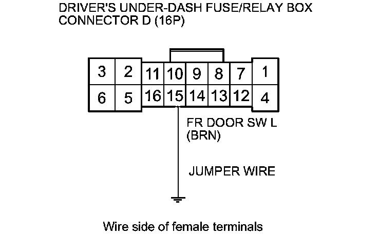 12. Connect driver's under-dash fuse/relay box connector D (16P) terminal No. 15 and body ground with a jumper wire.