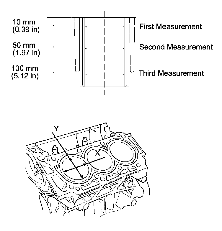 4. Measure the wear and taper in direction X and Y at three levels in each cylinder as shown. If measurements in any cylinder are beyond the oversize bore service limit, replace the engine block. If the engine block has to be rebored, refer to step 7 after reboring.