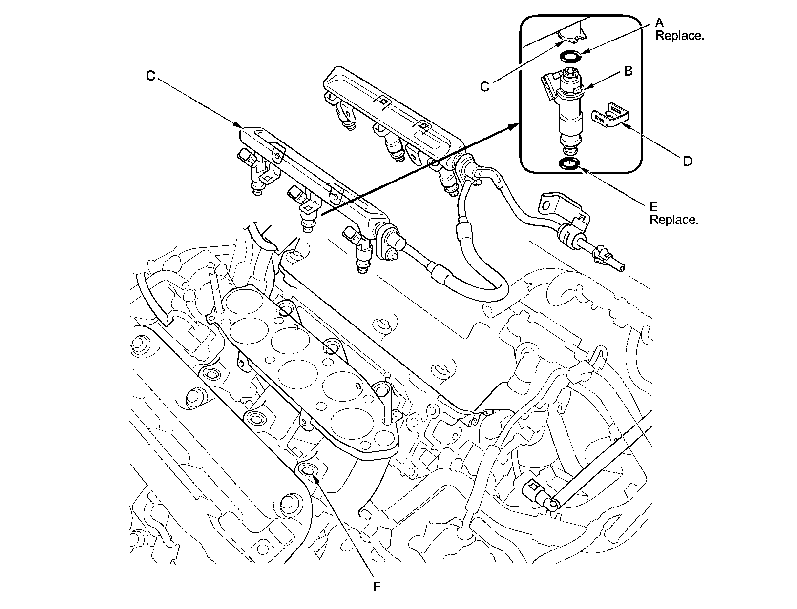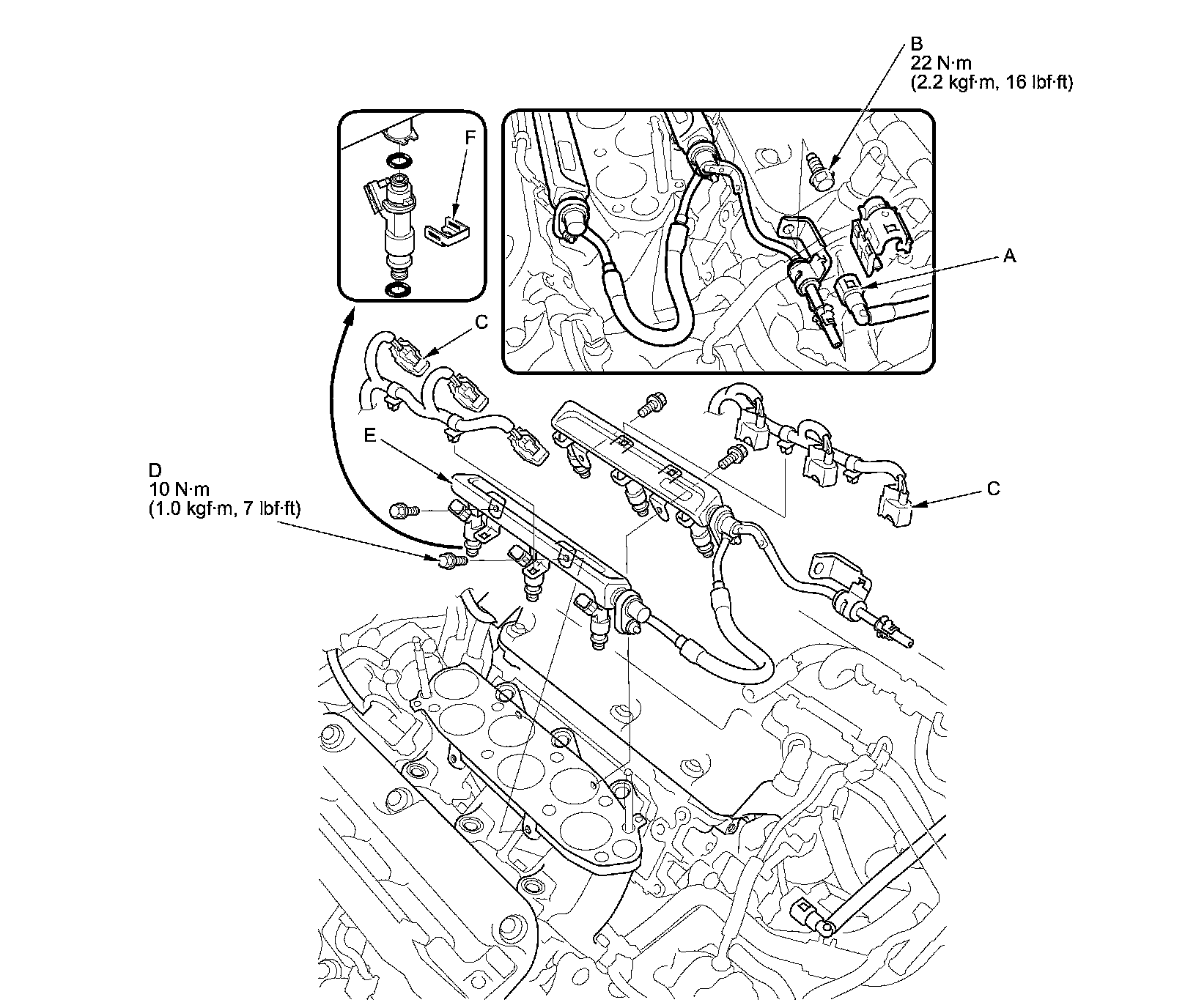 17. Turn the ignition switch to ON (II), but do not operate the starter. After the fuel pump runs for about 2 seconds, the fuel rail is pressurized. Repeat this two or three times, then make sure there are no fuel leaks.
