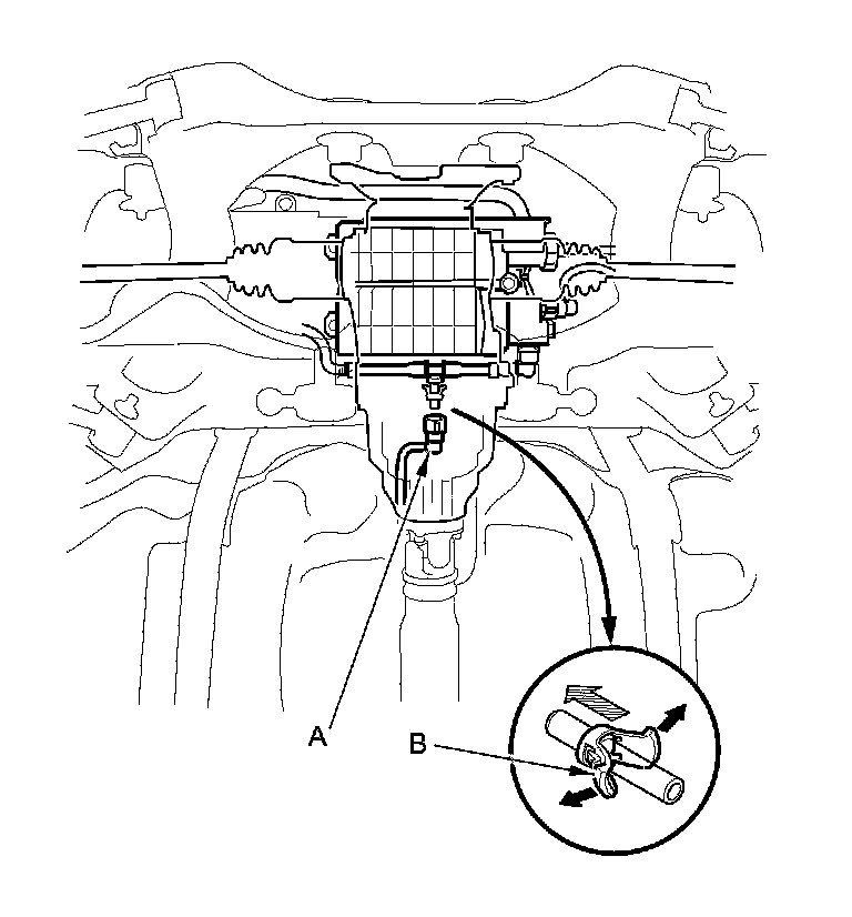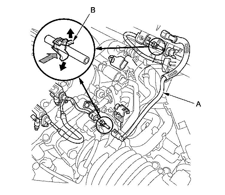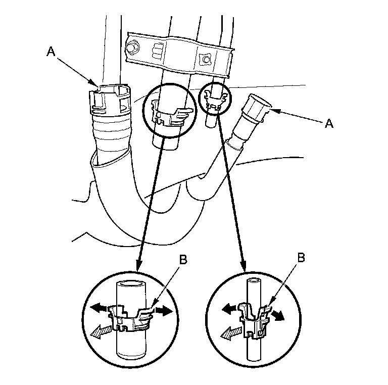 3. Before connecting a new fuel line/quick-connect fitting assembly (A), remove the old retainer (B) from the mating line.