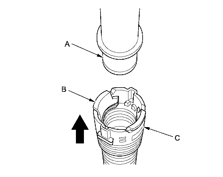 4. Align the quick-connect fittings with the line (A), and align the retainer locking tabs (B) with the connector grooves (C). Then press the quick-connect fittings onto the line until both retainer tabs lock with a clicking sound.