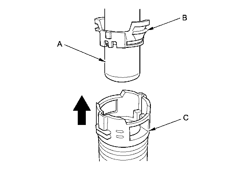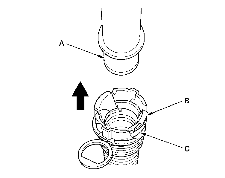 5. When you reconnect the connector with the old retainer, make sure the connection is secure and the tabs (A) are firmly locked into place; check visually and also by pulling the connector (B). When you replace the fuel line with a new one, make sure you remove the ring pull (C) upwards after you confirm the connection is secure.
