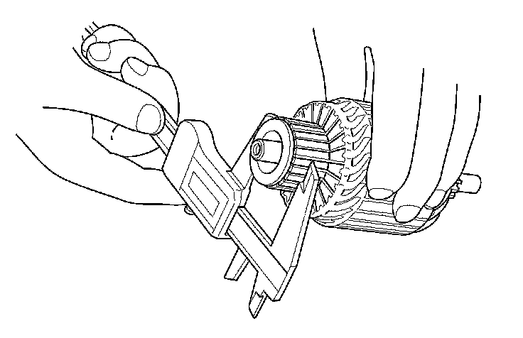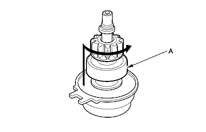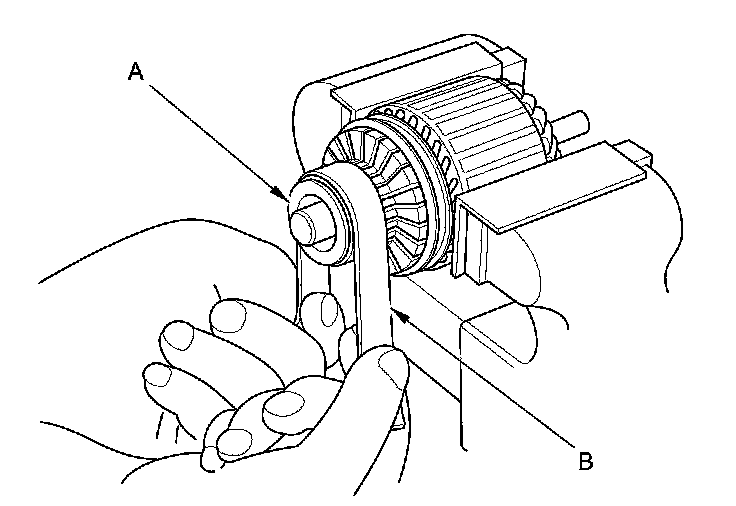 14. Hold the overrunning clutch (A), and turn the drive gear (B) in the direction shown to make sure it turns freely. Also make sure the drive gear locks in the opposite direction. If it does not lock, replace the overrunning clutch assembly.