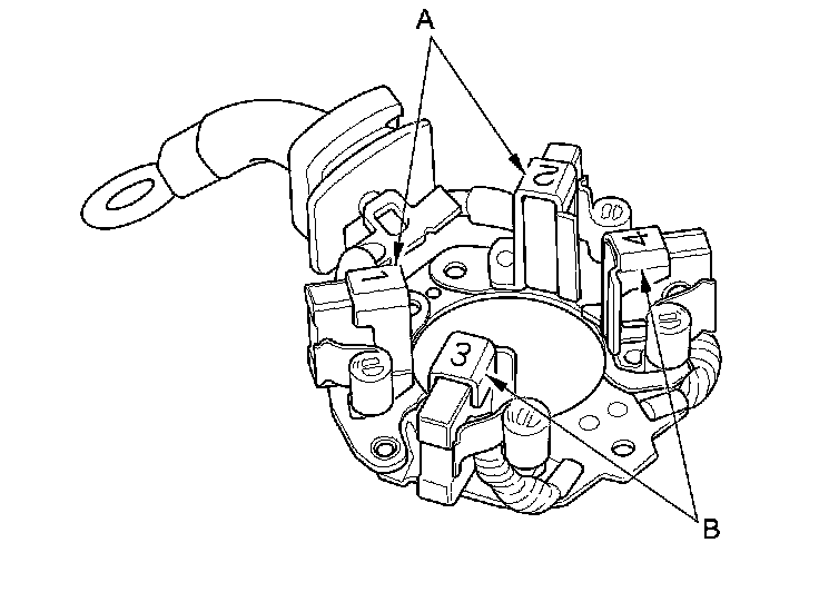 17. Check for continuity between the (+) brush holders (A) and the (-) brush holders (B). If there is continuity, replace the brush holder assembly.