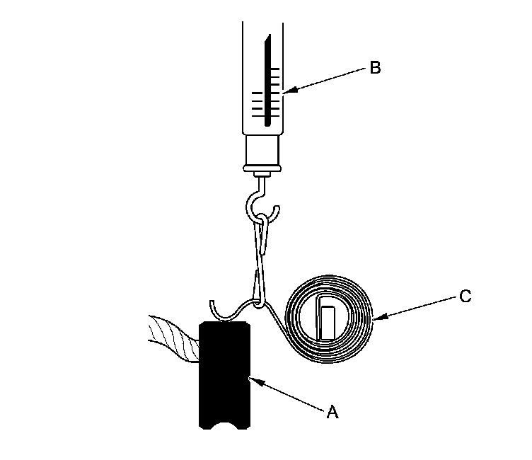 18. Insert the brush (A) into the brush holder, and bring the brush into contact with the commutator, then attach a spring scale (B) to the spring (C). Measure the spring tension at the moment the spring lifts off the brush. If it is not within the standard, replace the brush holder assembly.