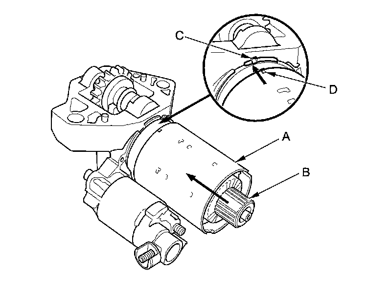 20. Install the armature housing (A) and the armature (B) by aligning the slotted point (C) to the projection (D).