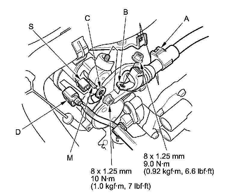 4. Remove the harness clamp (A), then disconnect the positive starter cable (B), the motor wire (C), and the S terminal connector (D).