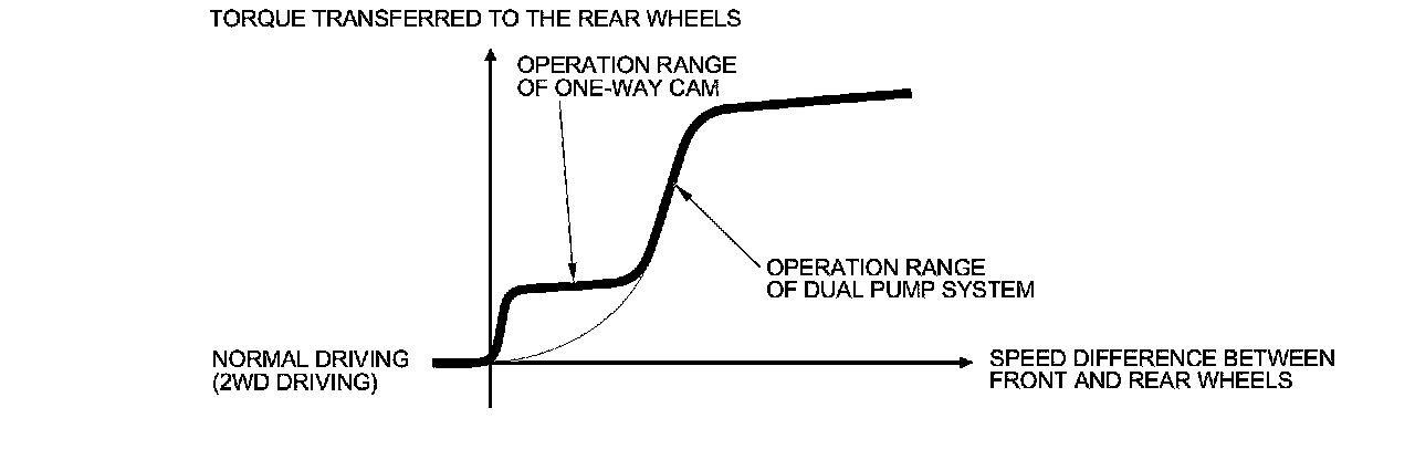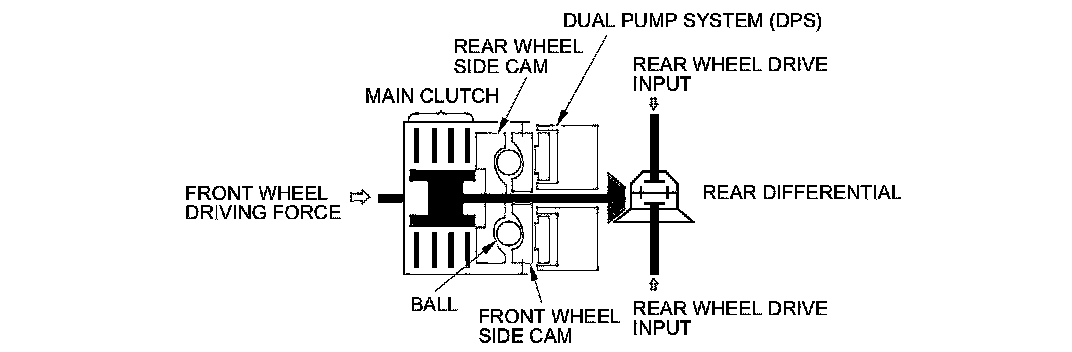When a difference of the front and rear wheel speeds develops, the difference in the rotational speed of the two cams also develops, and the front cam rotational speed exceeds that of the rear cam. When this happens, the balls move along the cam groove, pushes and widens the cams, and applies pressure to the main clutch. When the speed difference becomes greater, the dual pump system (DPS) operates. Since the cam unit is a one-way type, it only operates when driving forward.