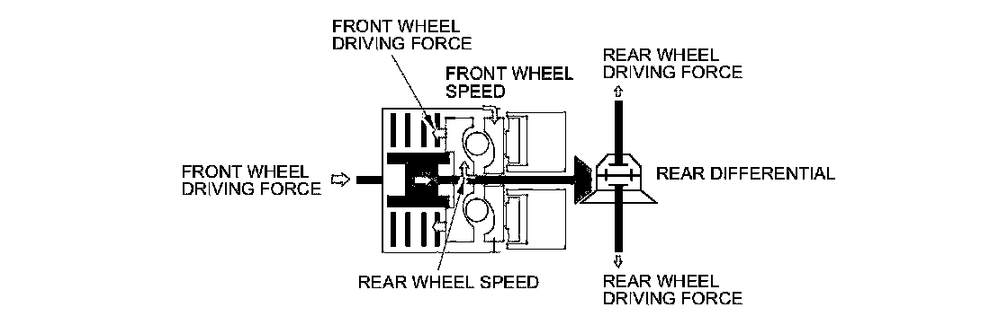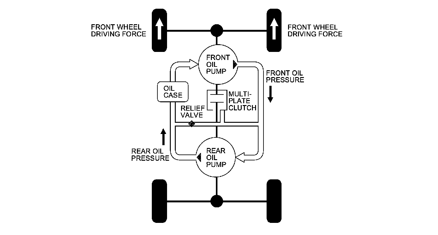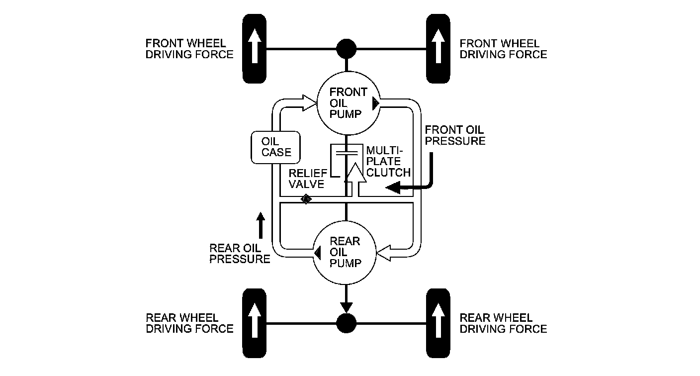 When the front and the rear wheel speeds are equal (no slipping) as in normal driving, the oil discharged from the front pump and the oil drawn in the rear pump are equal, so the hydraulic pressure that pushes the wet-type multi-plate clutch is not developed, and the rear wheels are not driven.