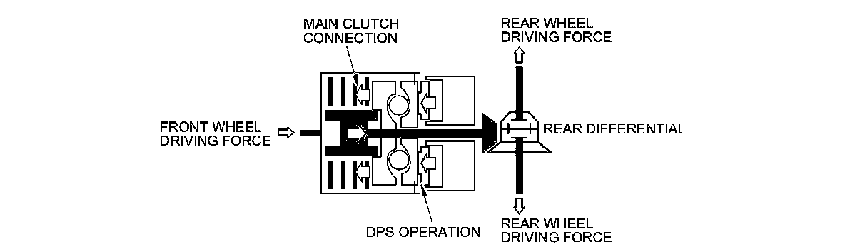 When DPS is not operating, the rear wheels follow the front wheels. From the rear driveshafts, the rear wheel operation is input to the differential, the hypoid ring gear, the drive pinion gear, the clutch hub, the clutch disc, and power is not transmitted to the rear wheels.