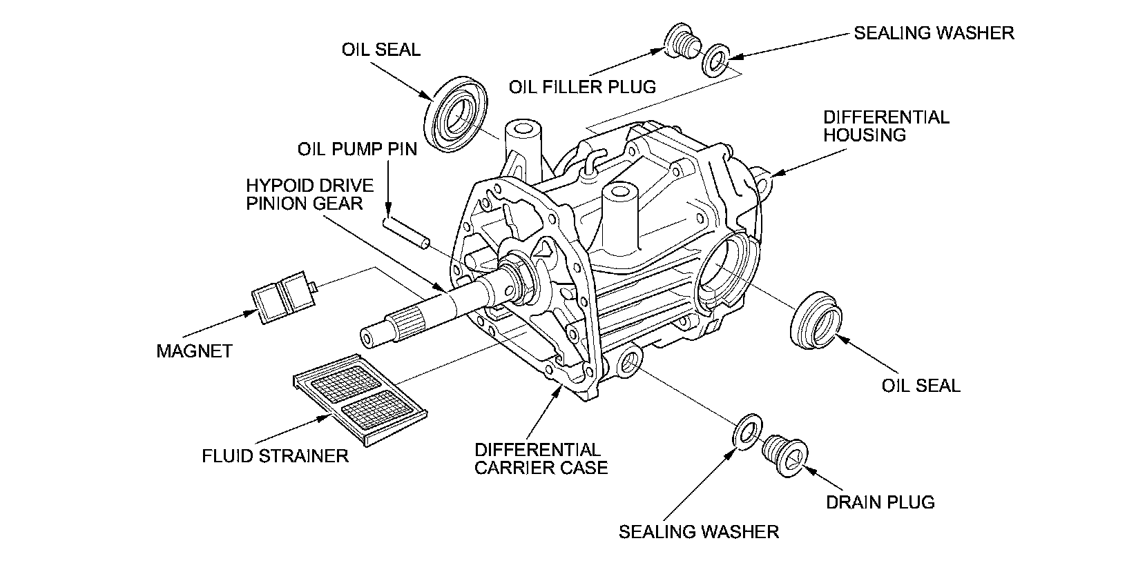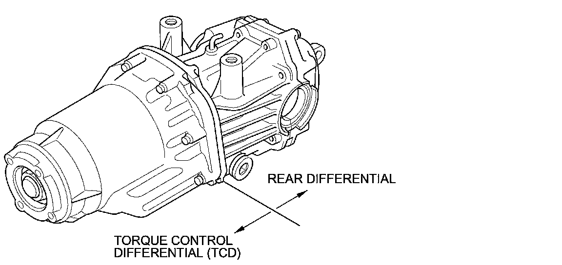 The rear differential assembly consists of the torque control differential (TCD) that controls the 4WD mechanism and the rear differential mechanism section.