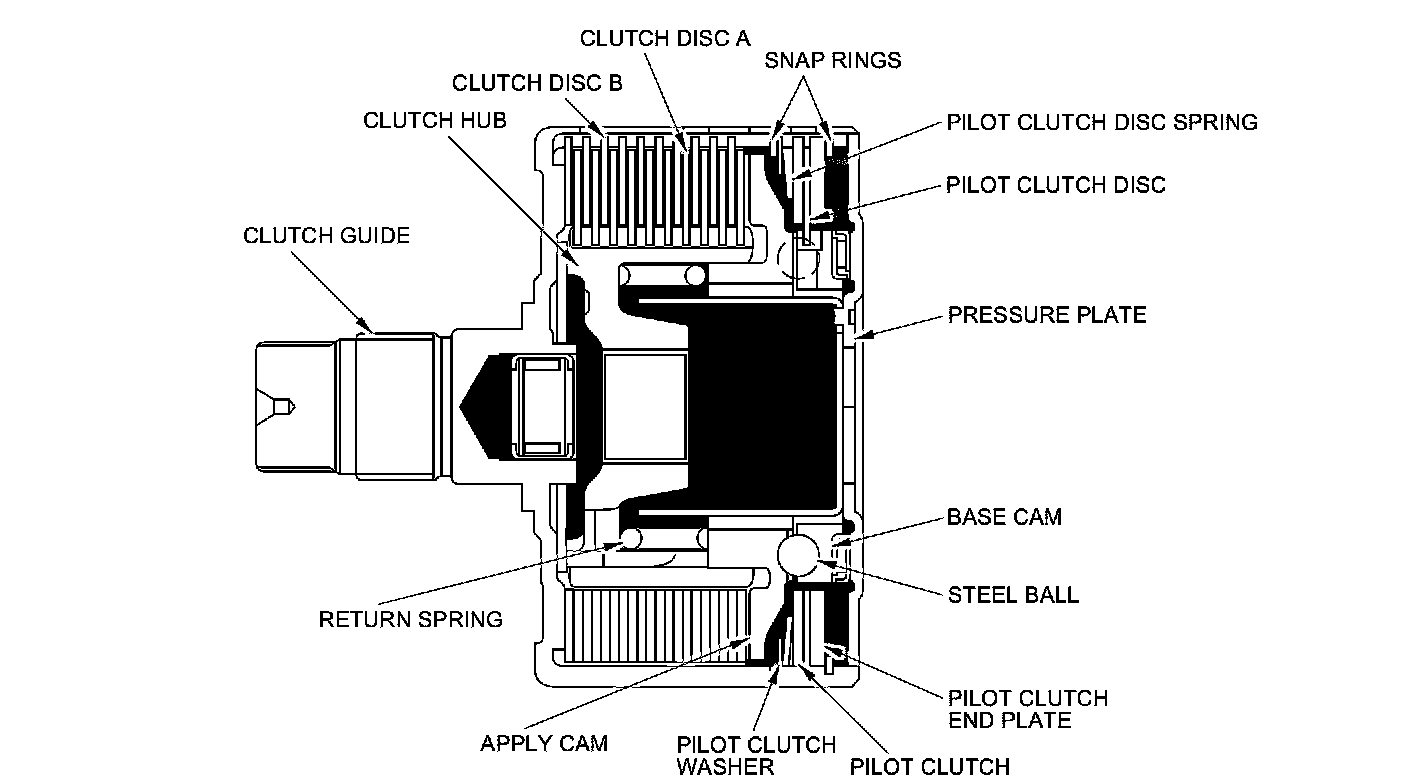 The differential clutch assembly is composed of the clutch guide, clutch disc A/B, the clutch hub, the pressure plate, and also the one-way cam, the pilot clutch assembly, and other parts. The clutch guide gets the front wheel driving force from the propeller shaft, while the clutch hub meshes with the hypoid drive pinion gear, and follows the speed of the rear wheels.
