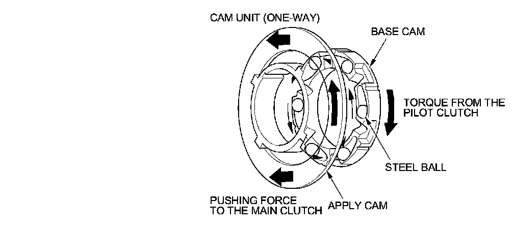 The one-way cam consists of the base cam that spins with the clutch guide via the pilot clutch, the apply cam that meshes with the clutch hub, and the steel balls that are sandwiched by the two cams. The base cam rotates at front wheel speed and the apply cam rotates at rear wheel speed.