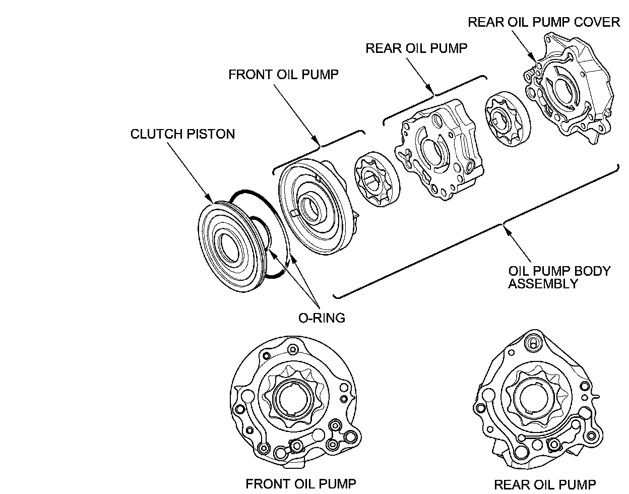 The pump body assembly consists of the front oil pump, the rear oil pump, and the rear oil pump cover, all with a built-in hydraulic circuit. The front oil pump is driven by the pressure plate component.