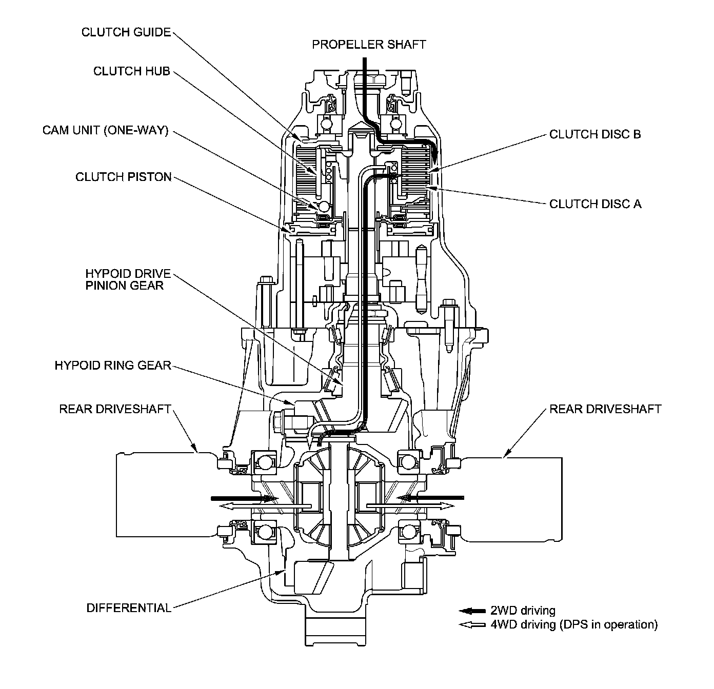 When the one-way cam operates, the clutch plate and the clutch disc become connected, and from the clutch hub, the driving force is transmitted to the drive pinion gear, the ring gear, the differential, the rear driveshafts, and to the rear wheels.