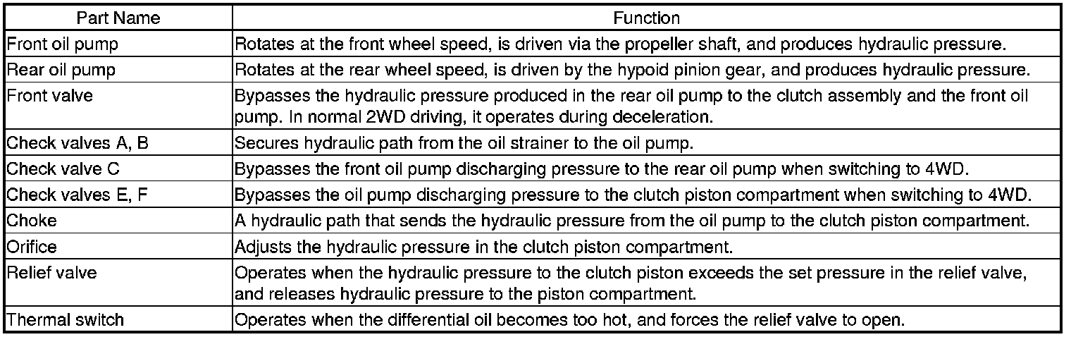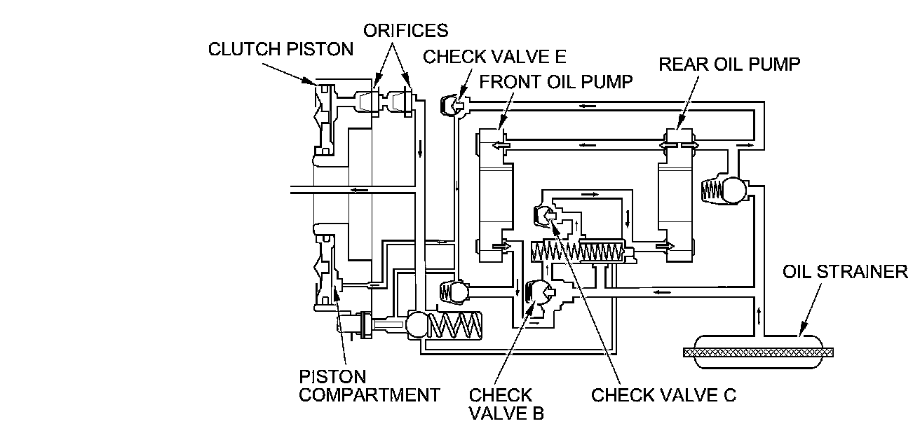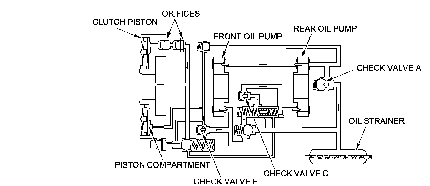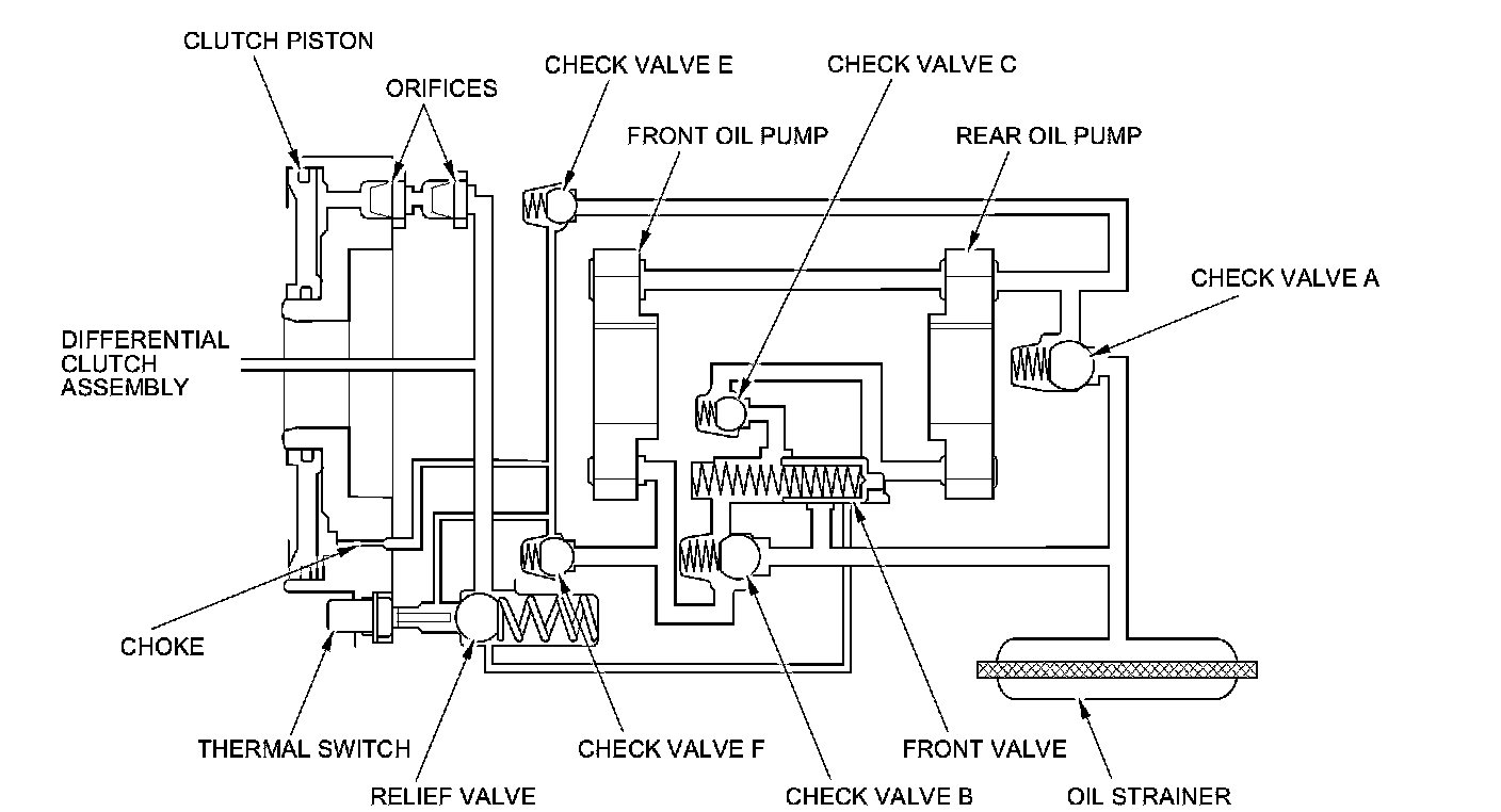 Built inside the oil pump assembly, the hydraulic circuit provides clutch assembly lubrication together with 4WD control. The hydraulic circuit consists of the front and rear oil pumps, the front valve and five check valves for hydraulic route switching, the choke section which is the hydraulic path to the clutch piston compartment, and the two orifices that controls the hydraulic pressure in the piston compartment.