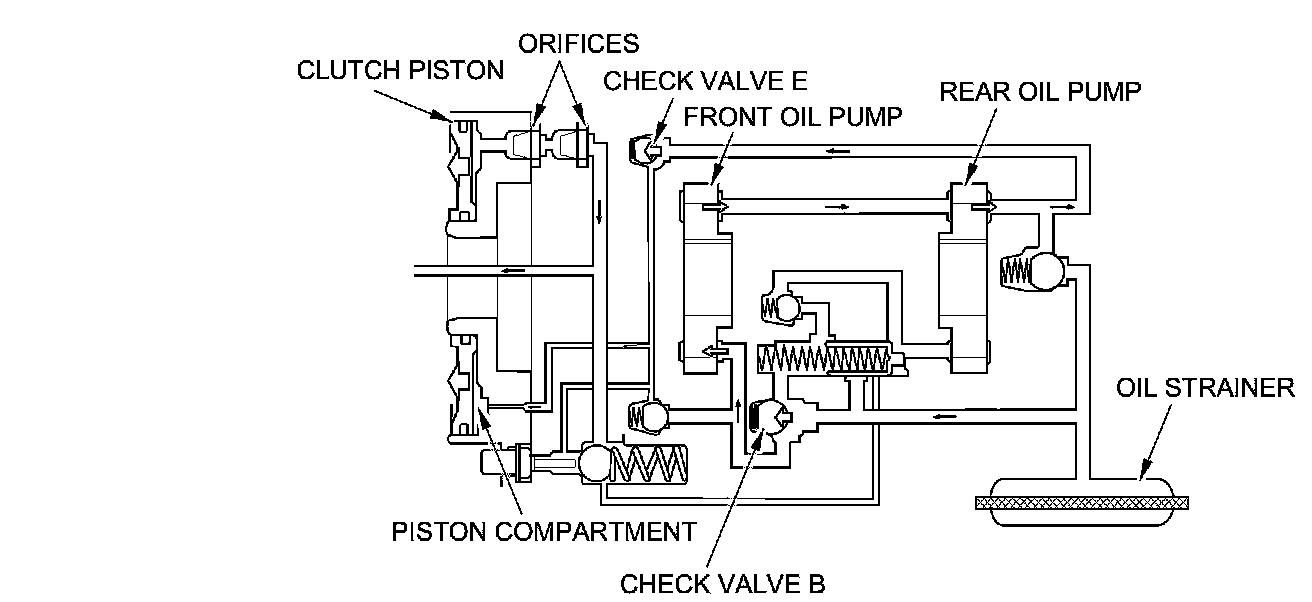 3. Excess oil from the oil discharged from the rear oil pump exceeds the drawing capacity in the front oil pump, passes through check valve E, travels to the piston compartment, and is pressure-regulated at the two orifices.