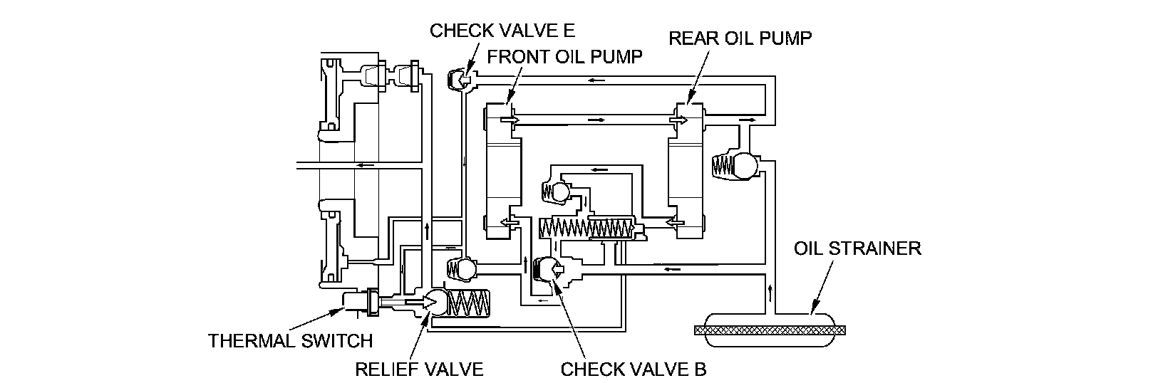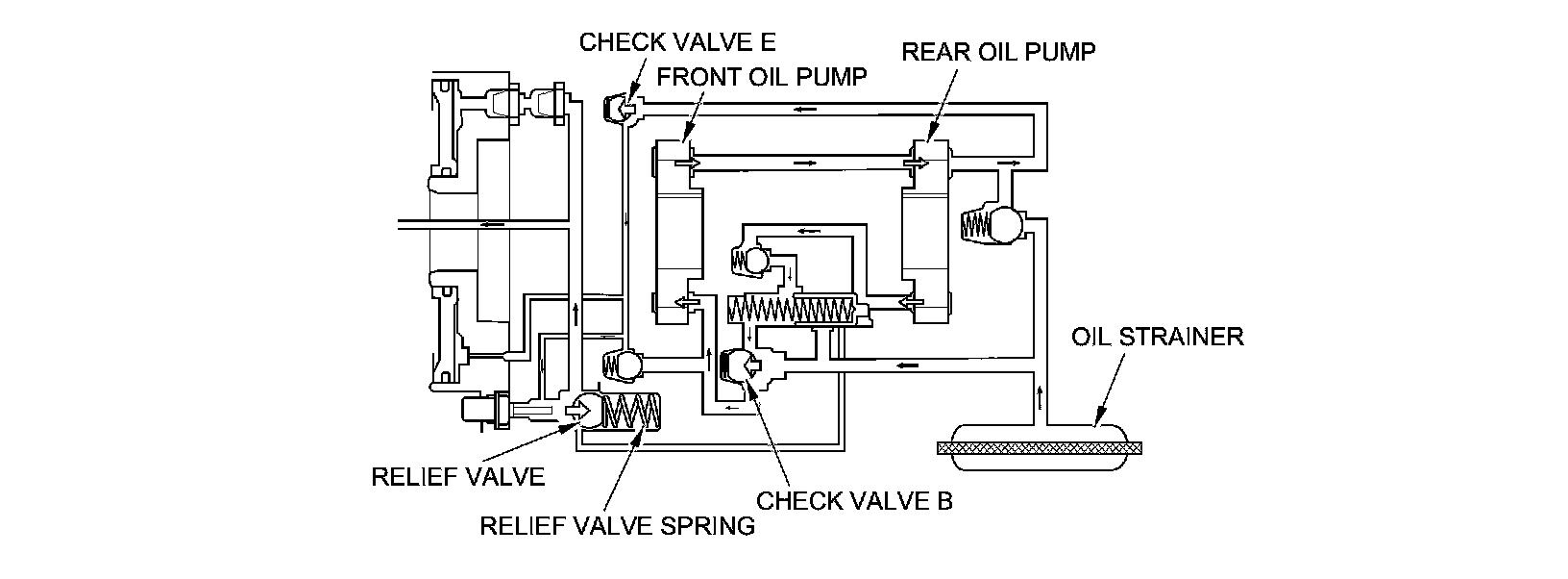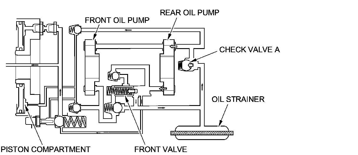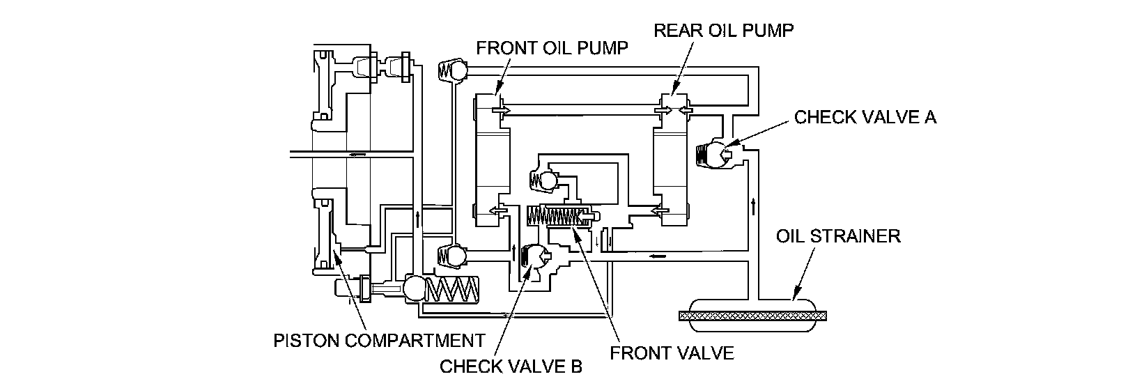 2. During reverse driving, the oil pumps rotate in reverse. However, the oil drawn in by the front pump from the oil strainer passes check valve A and the rear oil pump, and then is drawn in and discharged by the front oil pump.